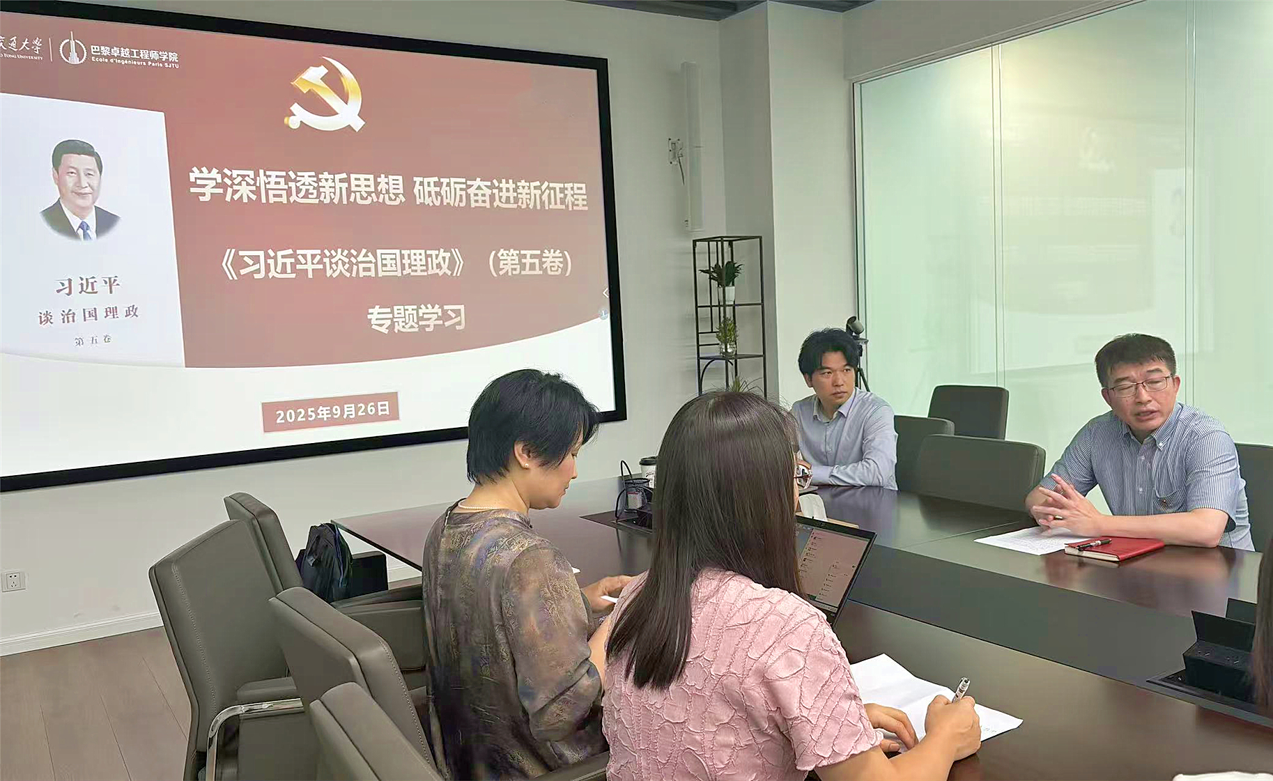为持续深入学习贯彻习近平新时代中国特色社会主义思想,9月26日,巴黎卓越工程师学院组织教师职工开展《习近平谈治国理政》第五卷专题学习会,特邀马克思主义学院刘伟副教授作辅导报告。学院党委书记熊振华,党委委员魏光华、王少博,理论学习中心组成员,教工支部党员共同参加学习。会议由魏光华主持。
