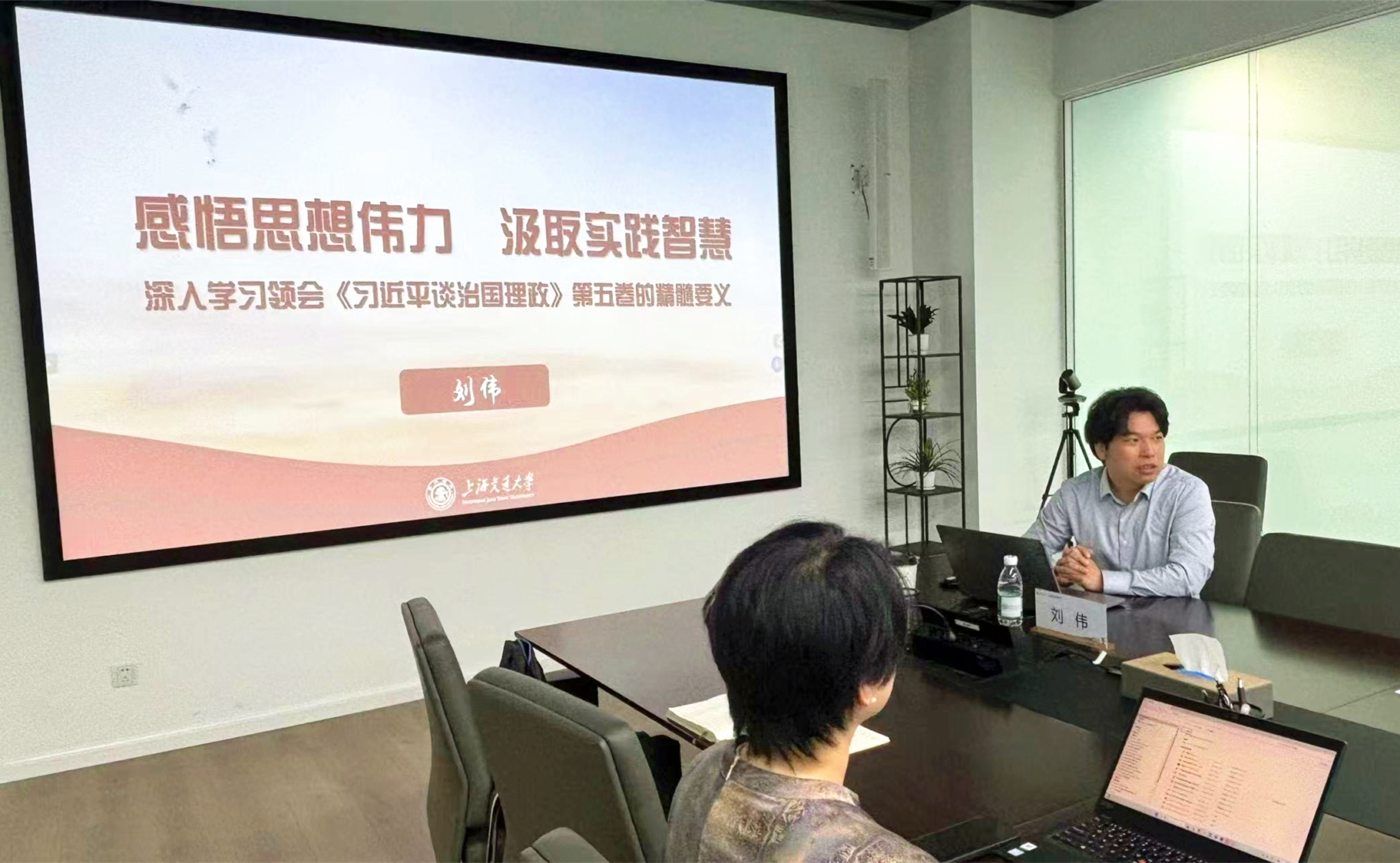 刘伟副教授以“深入学习领会《习近平谈治国理理政》第五卷的精髓要义”为主题,系统阐释了以“中国式现代化全面推进中华民族伟大复兴”为主线的基本框架,深入解读了关于新质生产力、教育科技人才一体化发展、高水平对外开放、党的自我革命等重大战略部署,引导与会人员深刻领会其精神实质与时代价值。他强调,学习第五卷贵在融会贯通、学以致用。全体人员应着力掌握贯穿其中的马克思主义立场、观点、方法,将理论学习同实际工作紧密结合,特别是要立足中外合作办学与卓越工程师培养的学院特色,将学习成果转化为坚定理想信念、提升育人本领、服务国家战略的强大动力。