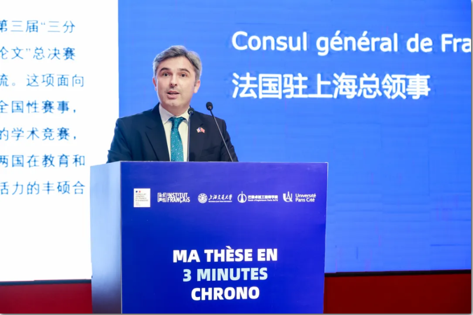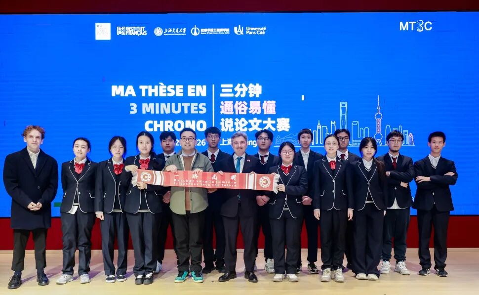 2025年11月26日,第三届“三分钟通俗易懂说论文(MT3C)”大赛年度总决赛在上海交通大学李政道图书馆报告厅隆重举行。本次赛事由法国驻上海总领事馆与上海交通大学主办、上海交通大学巴黎卓越工程师学院承办、法国巴黎西岱大学支持。法国驻上海总领事王度(Joan VALADOU)、巴黎西岱大学副校长安托尼·库什那(Antoine Kouchner),上海交通大学副校长张兆国、巴黎卓越工程师法方院长Zied MOUMNI等出席。来自上海交通大学、上海法国学校(Lycée Français de Shanghai )、上海市光明中学的百余名师生共同观看。