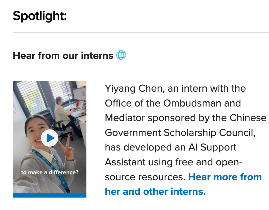 Beyond AI projects, Chen Yiyang also participated in data analysis and visualization for UNHCR's Global Displacement Trends, using Python to uncover patterns in data concerning refugees, internally displaced persons, and stateless individuals; assisted in producing the AI-generated annual review video for the Ombudsman and Mediator Office; Contributed to designing an employee burnout assessment questionnaire based on the Burnout Assessment Tool for the 2025 IOA conference; Hosted and supported 12 global online workshops—including Ubuntu Community Café and “How to Have a Difficult Conversation”—in Chinese, English, French, and Spanish, providing emotional support and dialogue spaces for staff navigating organizational change; Contributed to functional planning and page design for the NOMMO International Ombuds and Mediators Network member website.